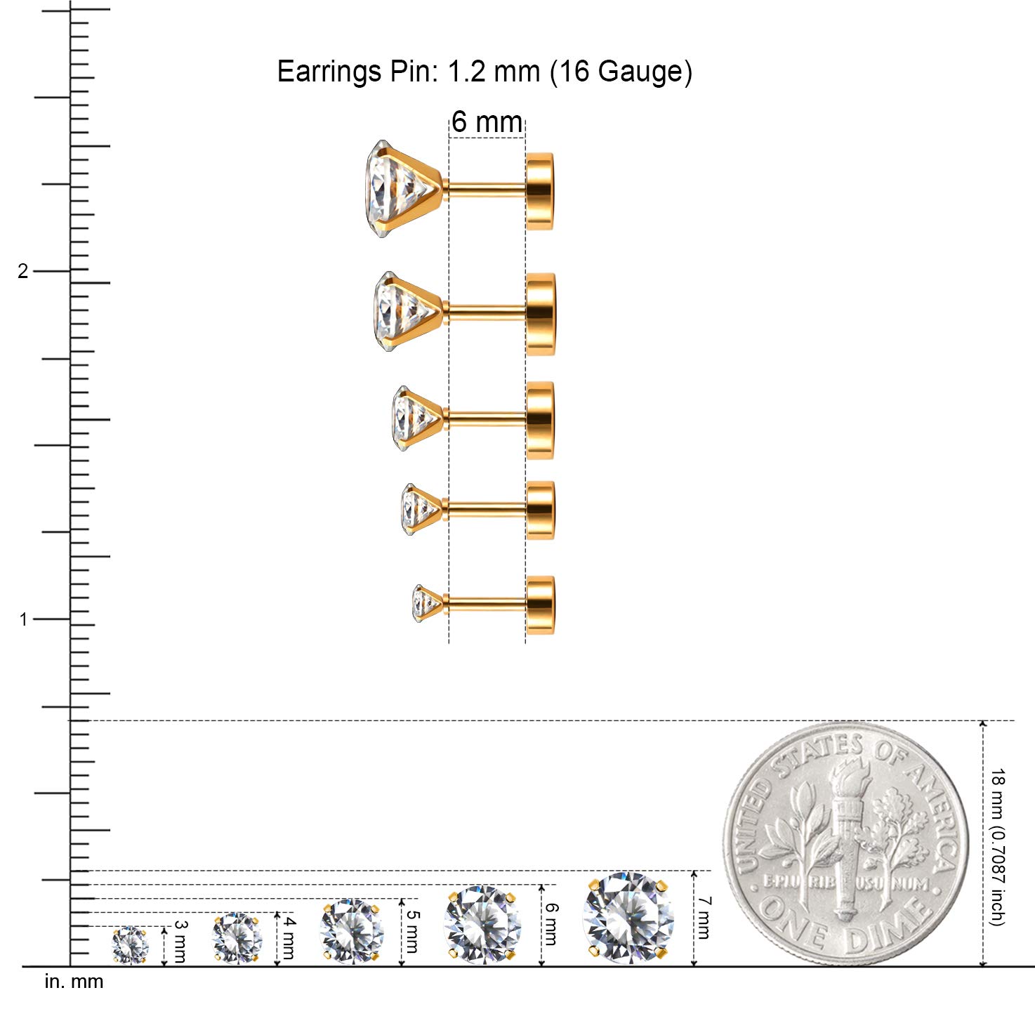 - SIZE: A set of 5 pairs earrings in different size - 3mm CZ (total length: 11mm) / 4mm CZ (total length: 12mm) / 5mm CZ (total length: 12.5mm) / 6mm CZ (total length: 13mm) / 7mm CZ (total length: 14.5mm).