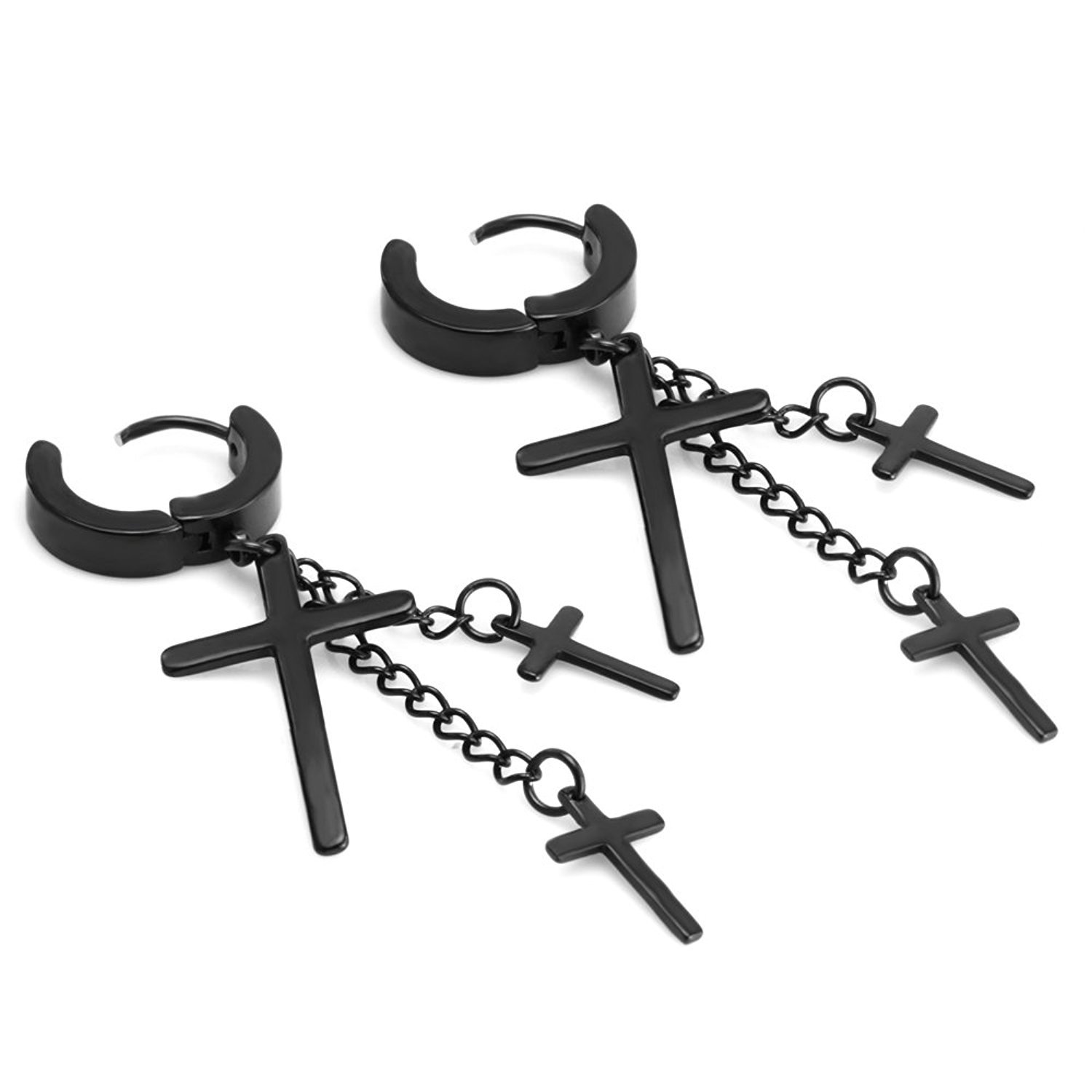 JewelrieShop Cross Tassel Stainless Steel Urban Huggie Hinged Hoop Dangle Earrings—