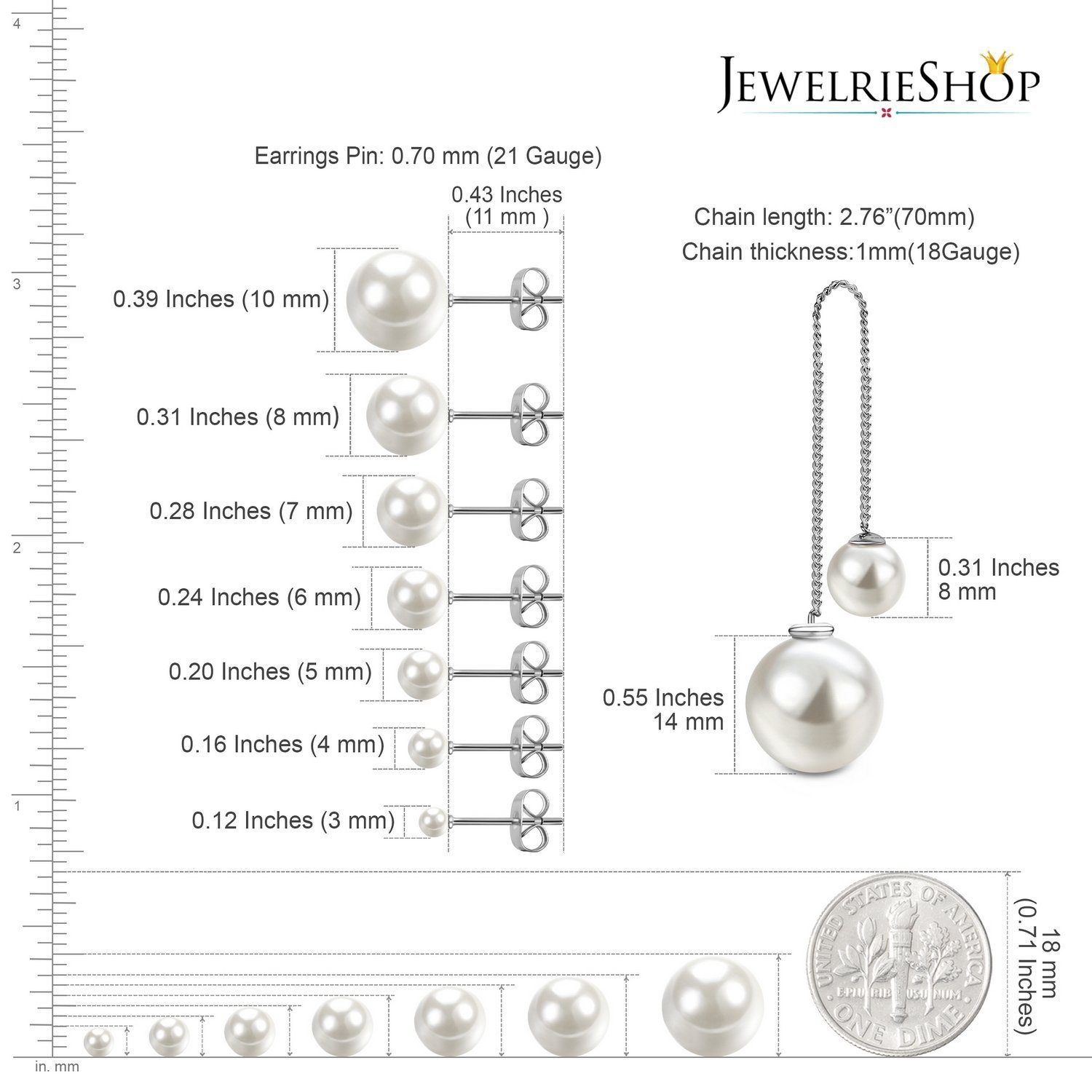 - PEARL STUD EARRINGS SIZE - 7 pairs of imitation pearl stud earrings. The diameter of ball included 3mm, 4mm, 5mm, 6mm, 7mm, 8mm, 10mm.